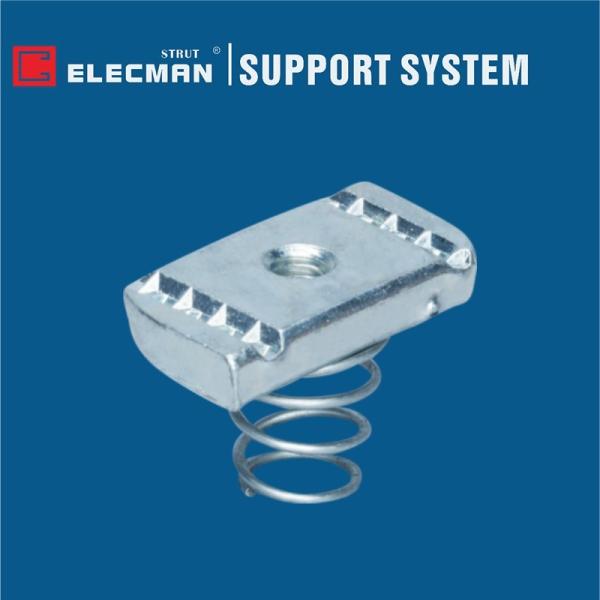 ELECMAN ® Galvanized steel strut channel clamping nut with short springs are used with channel support syestems. The grooves along the edges act as small teeth that can lock onto the channel when tightened. Channel systems are designed for multiple applications, including supporting containment and pipe brackets for all types of electrical and mechanical installations and are a key part of making sure all the infrastructure stays together.