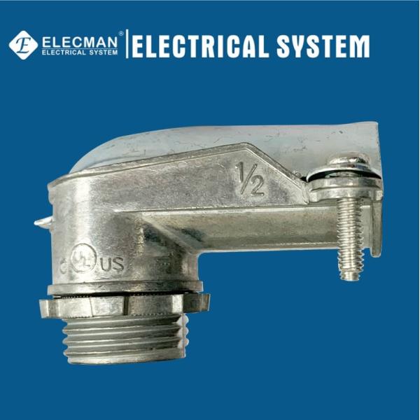 ELECMAN® Zinc squeeze connectors 90 degree flexible conduit to box type are used to connect flexible metal conduit, aluminum and steel AC and MC cable to a steel outlet box or other metal enclosure.